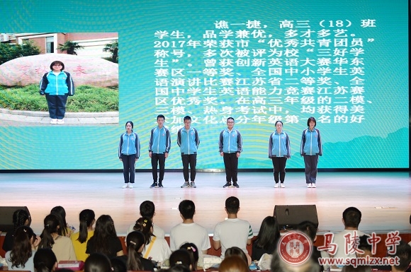 同窗三年,同学们都积攒了很多的青春感悟。同学们以代表队的形式登台,分组介绍学生代表,并进行具有学科特色的的展示表演。文科代表队伍高三(17)班的潘妍妤同学演唱歌曲;理科代表队展示了理科班学霸笔记图片;艺术生代表队高三(10)班的周可演唱歌曲《你曾是少年》;体育生代表队则通过视频展示体育健将训练的艰苦过程,代表孟子靖、张文瀚上台分享;美术生代表队展示绘画作品且由高三(3)班何冠希、马瑞及高三(18)班谯一捷等代表上台分享。同学代表充分展示了自己在马陵中学三年的收获和成长,台下很多同学随着他们一起重温了自己难忘的高中时光。
