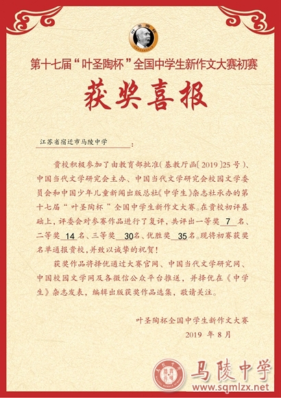 在课程中心的精心组织下,在高一、高二语文备课组的广泛动员、积极参与下,我校在2019年第17届“叶圣陶杯”全国作文创新大赛初赛中获得重大突破,取得优异成绩:一等奖7名,二等奖14名,三等奖30名、优胜奖35名。其中一等奖选手将于9月中旬参加全国现场决赛。