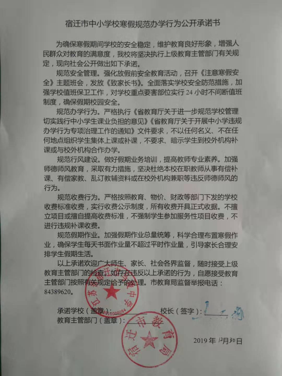 关于公示宿迁市中小学校寒假规范办学行为公开承诺书的通知