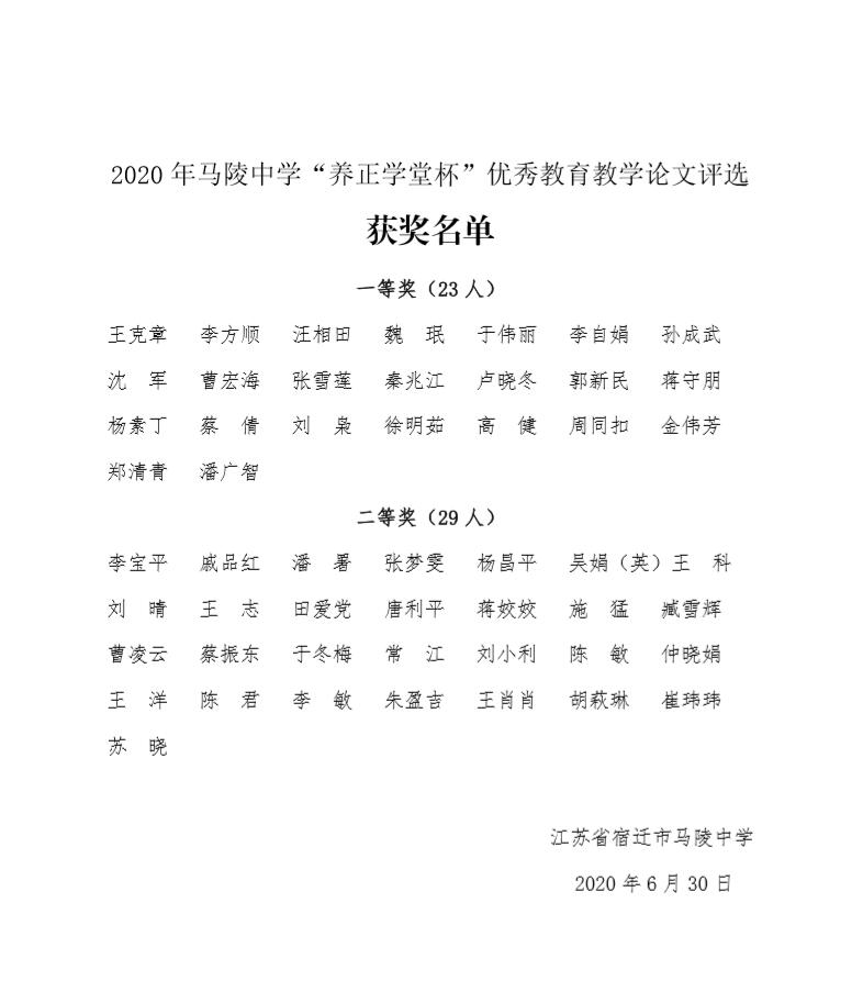 2020年马陵中学“养正学堂杯”优秀教育教学论文评选获奖名单