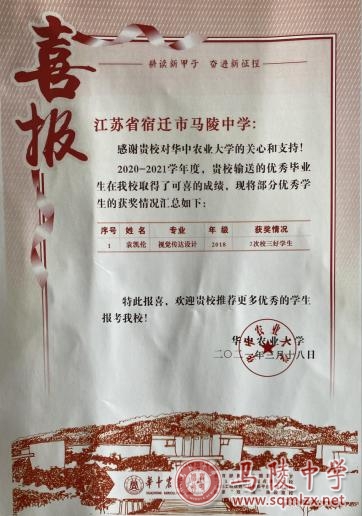 日前,我校收到华中农业大学的一封喜报和优质生源基地的牌匾。我校2018届优秀毕业生袁凯伦,现为华中农业大学2018级学生,于2020-2021学年度,两次获华中农业大学“校三好学生”称号。华中农业大学特此发来喜报,感谢我校对袁凯伦的培养和关爱。