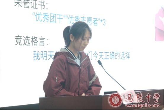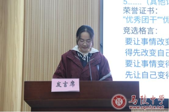 经过严格有序的投票、计票,本次大会选出马陵中学新一届学生会主席团。具体分工如下:学生会主席张依涵、学生会副主席徐嘉琳和吴双、纪检部部长卓胜泽、生活部部长何欣悦、文宣部部长郝毅、组织部部长薛陆璐。