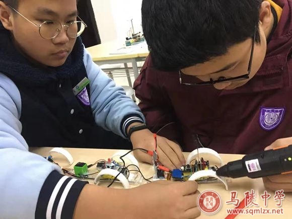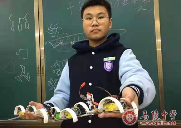 通用技术学科组在机器人社团成员中精心挑选参赛选手:高一的甄子鸣、李少坡、单星源三位同学。在李伟成、王崇和高峰老师的指导下,三位同学确定参赛项目为千足虫仿生机器人运动方式研究。师生攻坚克难,通过反复研究,精心制作与调试,成功通过了市级初赛。